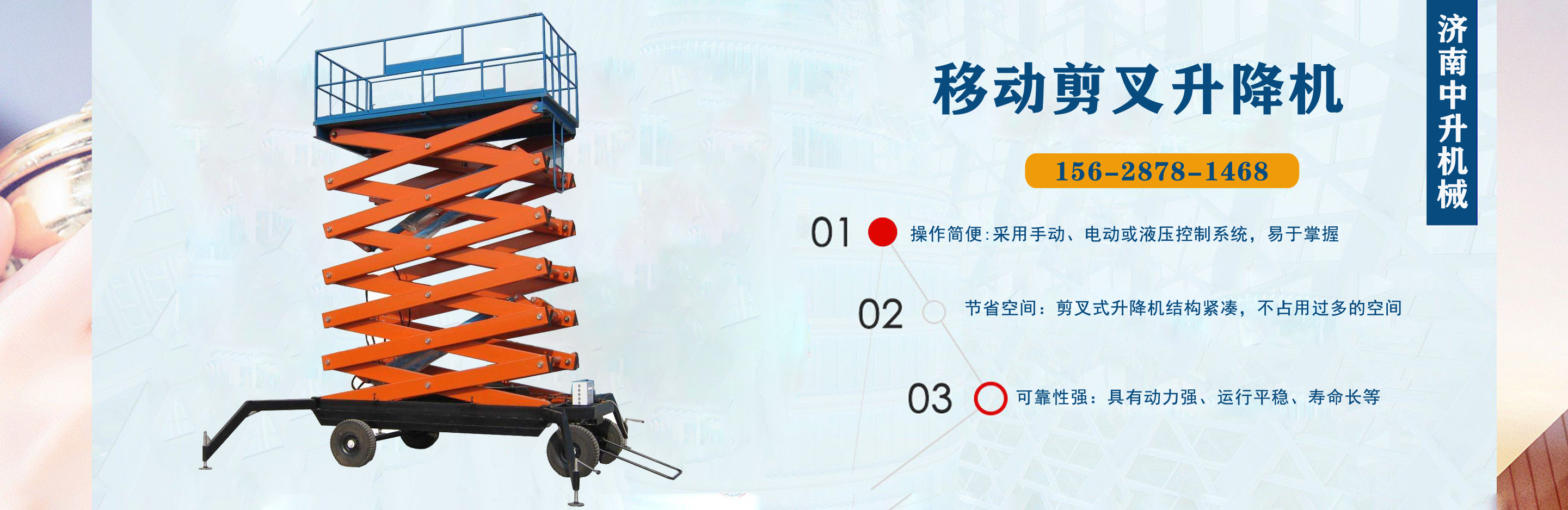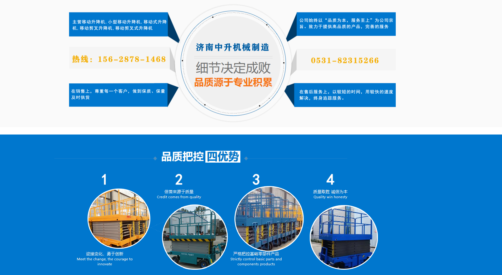 濟(jì)南中升機(jī)械制造有限公司主營(yíng)移動(dòng)升降機(jī),小型移動(dòng)升降機(jī),移動(dòng)式升降機(jī),移動(dòng)剪叉升降機(jī),移動(dòng)剪叉式升降機(jī)等產(chǎn)品,信譽(yù)良好,歡迎前來(lái)咨詢訂購(gòu)! 在銷售上,尊重每一個(gè)客戶,做到保質(zhì)、保量及時(shí)供貨;在售后服務(wù)上,以較短的時(shí)間,用較快的速度解決,終身追蹤服務(wù)?! 」臼冀K以“品質(zhì)為本,服務(wù)至上”為公司宗旨。致力于提供高品質(zhì)的產(chǎn)品,完善的服務(wù),快捷的供貨,無(wú)論您身處何方,都能感受到我們的優(yōu)良服務(wù)??蛻糁辽?,誠(chéng)信為本?! g迎各界朋友來(lái)電,來(lái)函垂詢,選購(gòu)!...